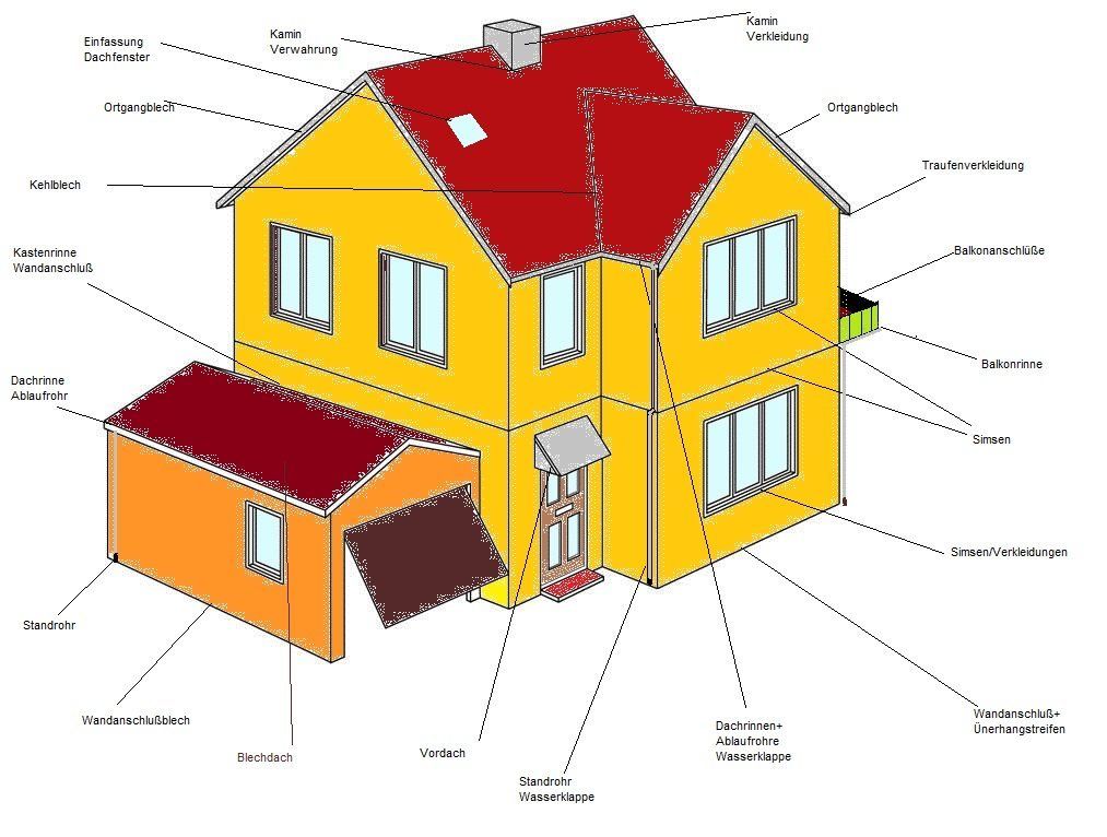 Wie im Modell unter dem Text dargestellt, können Sie die Bereiche genau einsehen, in welchen ein Spengler tätig ist, um zu gewährleisten, dass Ihr Dach, Garage und weitere Anschlüsse dicht bleiben.